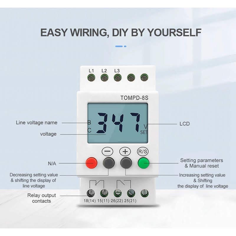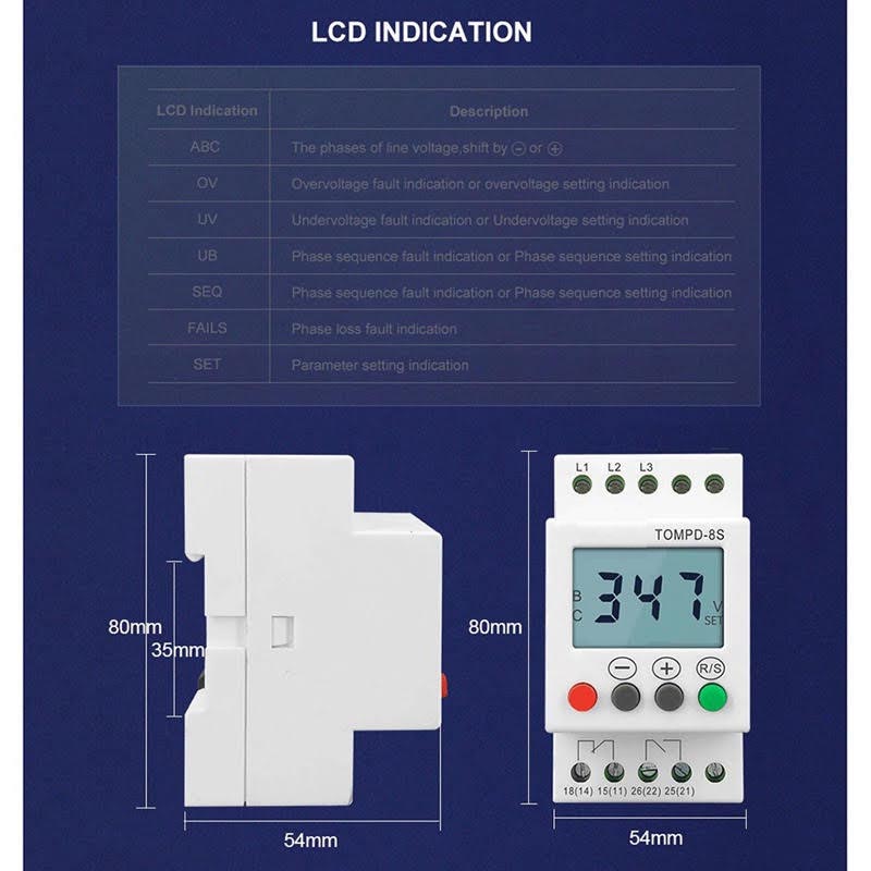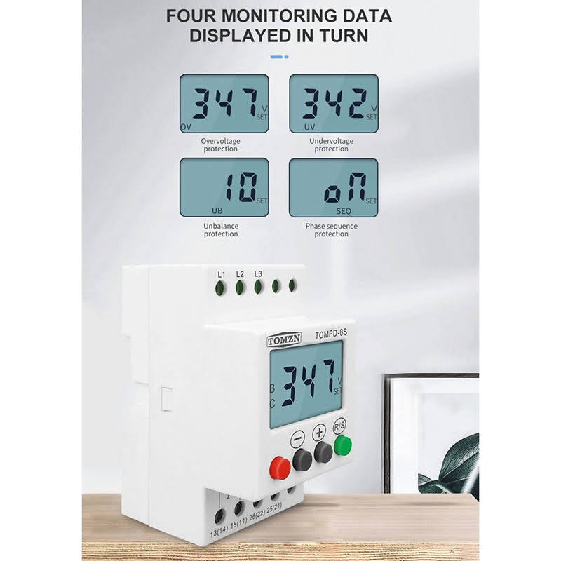Adjustable overvoltage and undervoltage, phase unbalance threshold. Independently adjustable delay time for overvoltage, undervoltage phase unbalance
