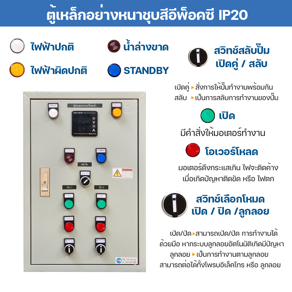 - เฟสโพรเทคเตอร์ ป้องกันไฟตก/ไฟเกิน/ไฟขาดเฟส/การหมุนกลับทาง